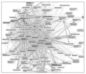 A big ball of mud is easy to identify by performing a dependency analysis on the software. An example big ball of mud can be seen below: