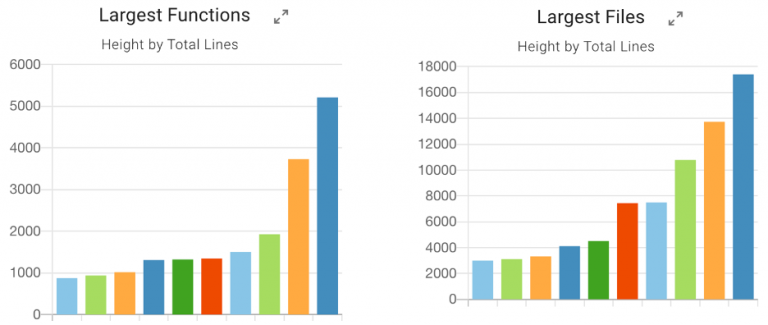 Large functions often do too much, indicating an underlying issue with the code quality. Analyzing the code can point to potential problems. For example, in the graphs below, you can see the largest functions and files in an example code base. The most significant function in the code has over 5,000 lines of code (LOC)! On the flip side, there is a module with nearly 18,000 LOC!