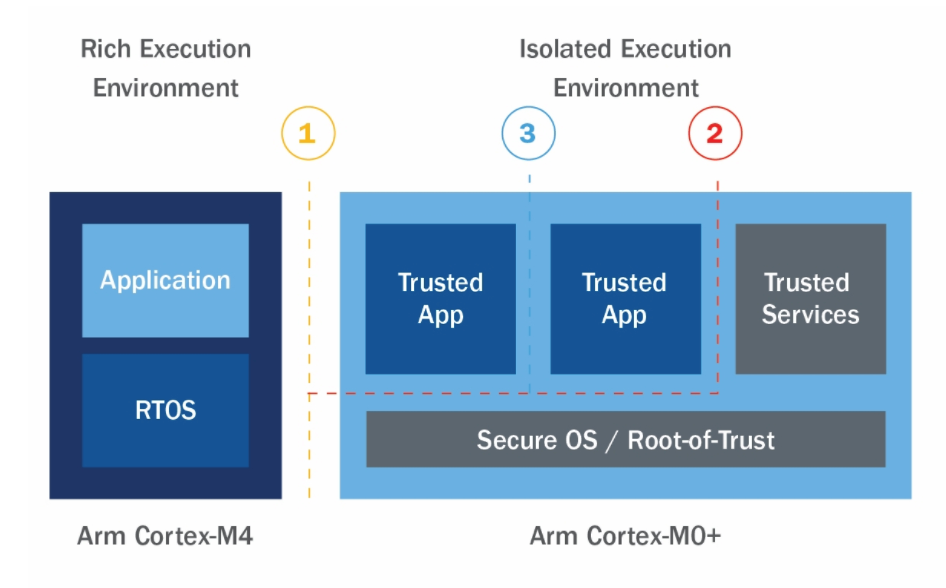 Another solution that I found to be quite intriguing is the new Cypress PSoC 6 security solution which includes multiple arm® Cortex®-M cores on the device. The first core, a Cortex-M0, is used as a security processor which sets up a Trusted Execution Environment (TEE) and is able to completely isolate secure operations. The second core, a Cortex-M4, is then used as the non-secure performance core for normal software operations. What’s intriguing about this solution is that it fits the most secure implementation for arm’s new Platform Security Architecture (PSA).