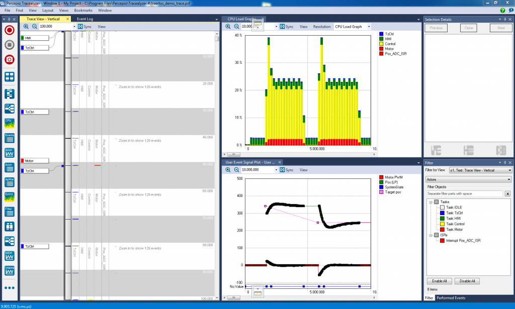 Figure 3 – Screenshot from Percepio Tracealyzer 4. This view is showing the task timeline, CPU utilization and user events occurring in a test system. (Source: Percepio Tracealyzer example recorded trace for FreeRTOS).