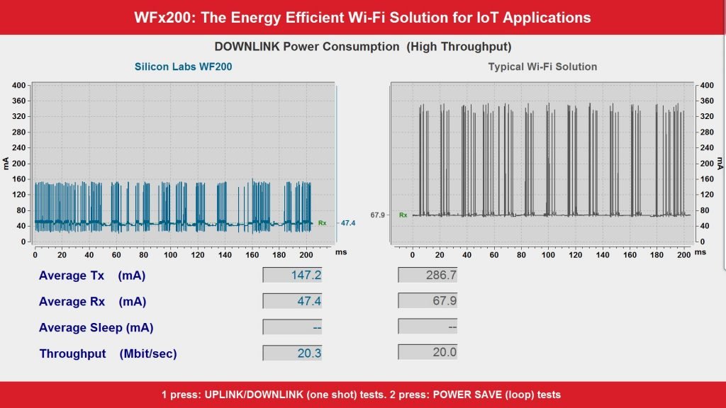 Figure 7 – Example demonstration from Silicon Labs that compared their new WFx200 Wi-Fi module to a typical industry Wi-Fi module. As can be seen, the transmit energy consumption is nearly 50% of a typical solution. (Source: Silicon Labs)