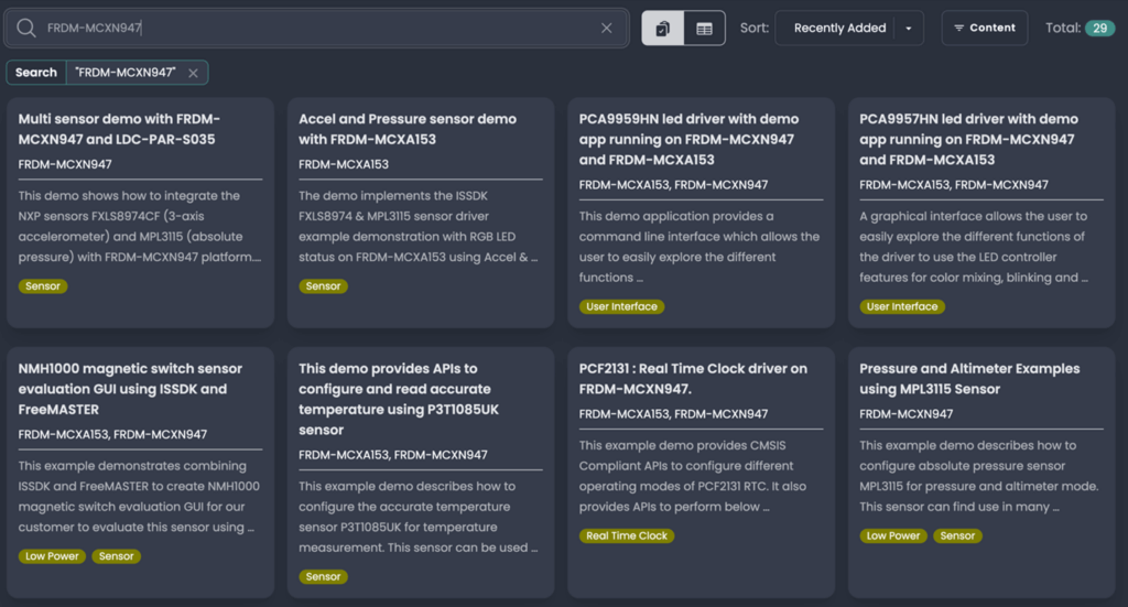 First, they can manually access any project using GitHub through manual links found at Application Code Hub. The manual approach allows developers to filter and search for projects their microcontroller supports and integrate them however they see fit. For example, if we are interested in projects for the FRDM-MCXN947, we can search the Application Code Hub and find something like Figure 1. You can see that there are currently 29 example projects (see the upper right of Figure 1) that can be leveraged to help accelerate development.