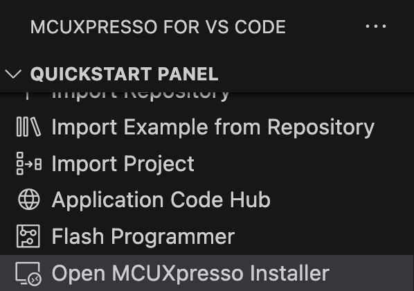 To do this, open Visual Studio Code and find the MCUXpresso for VS Code extension. In the QUICKSTART PANEL, you’ll find several options. One of them is “Open MCUXpresso Installer” as shown below in Figure 3.
