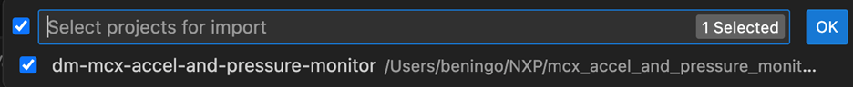 Figure 6: To import the project into your workspace, you must select the project(s) and click ok at the command palette in VS Code.