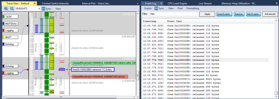 In the event data, a developer should be able to see the events that match the communication flow. Waiting for the message buffer, receiving the buffer, sending data to the MQTT queue and the logging queue and then waiting again on the message buffer. Closer scrutiny does reveal that there are malloc events that are occurring during run-time. If this application has hard real-time requirements, we may want to flag this since malloc is often non-deterministic and could result in other performance issues such as memory fragmentation. Notice also that we are only seeing memory being dynamically allocated and no memory is being released! So, either we have a memory leak in the application or this memory is freed elsewhere in the application.