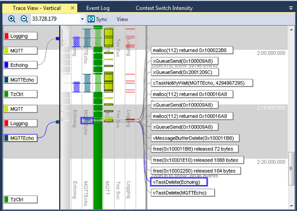 Tracking down the free statements could require us to dig into the code and match each malloc and free statement. Instead, I noted that this task was executing around 2 minutes and 7 seconds and filtered the event log for instances of free. Clicking on the event, a developer can see that the memory that is allocated in Echoing is used to store information that is also used by the Logging task. Once the Logging task is done with the data, it frees the memory location. The trace information can be seen below: