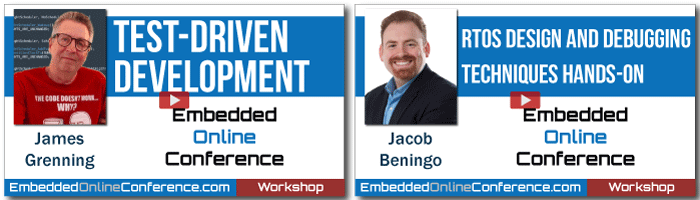 The 2021 Embedded Online Conference will also feature a full day dedicated to workshops where attendees will have the opportunity to learn through hands-on sessions. There are already two workshops confirmed; the first one will be about Test Driven Development (TDD) and will be taught by James Grenning, author of the highly acclaimed Test Driven Development for Embedded C book. The second workshop will be about RTOS Design and Debugging and will be given by Jacob Beningo, author of Reusable Firmware Development.