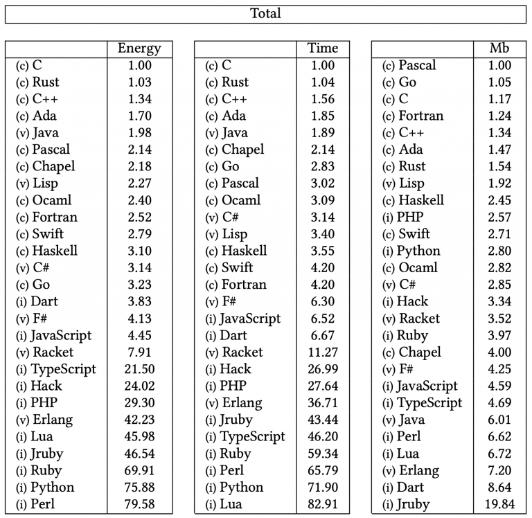 Figure 1 – The language results in the energy, time, and execution domains found in Table 4 of “Energy Efficiency across Programming Languages”.