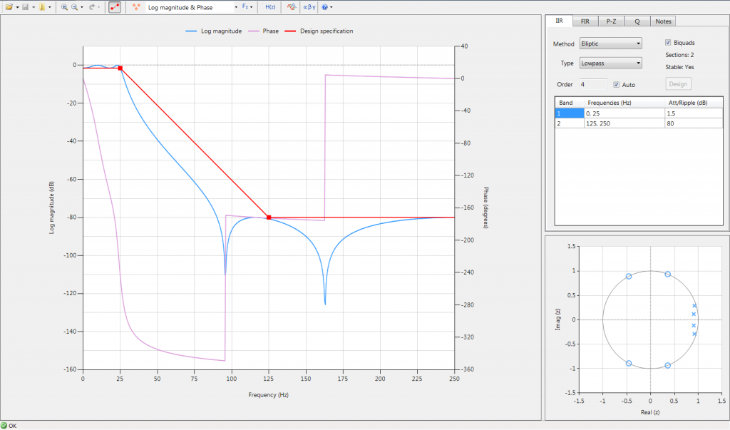 The main reasons that I have found the ASN Filter Designer to be useful is to create digital filters in a way that doesn’t require me to be an expert in digital signal processing. There are many applications where an embedded software developer needs to implement an IIR or FIR filter such as sensor filtering before using that sensor data to control a BLDC motor. I’ve found that I can easily create filters by either entering in the frequency band and requirements or I can literally just drag around lines on a graph to get the desired filter response. For example, below is a simple IIR low pass filter that uses an elliptic method to create the filter. The filter has two bands; one from 0 – 25 and then 125 to 250 Hz as can be seen in the image below: