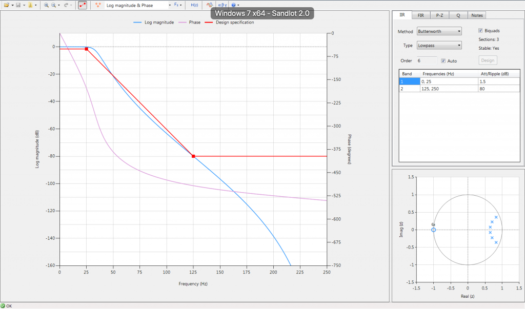 What’s great about this tool is that I can pretty easily change my filter. For example, in the upper right I could change my IIR elliptical filter to an IIR butterworth filter by just changing the method type. As you can see below, making this change instantly changes the filter response: