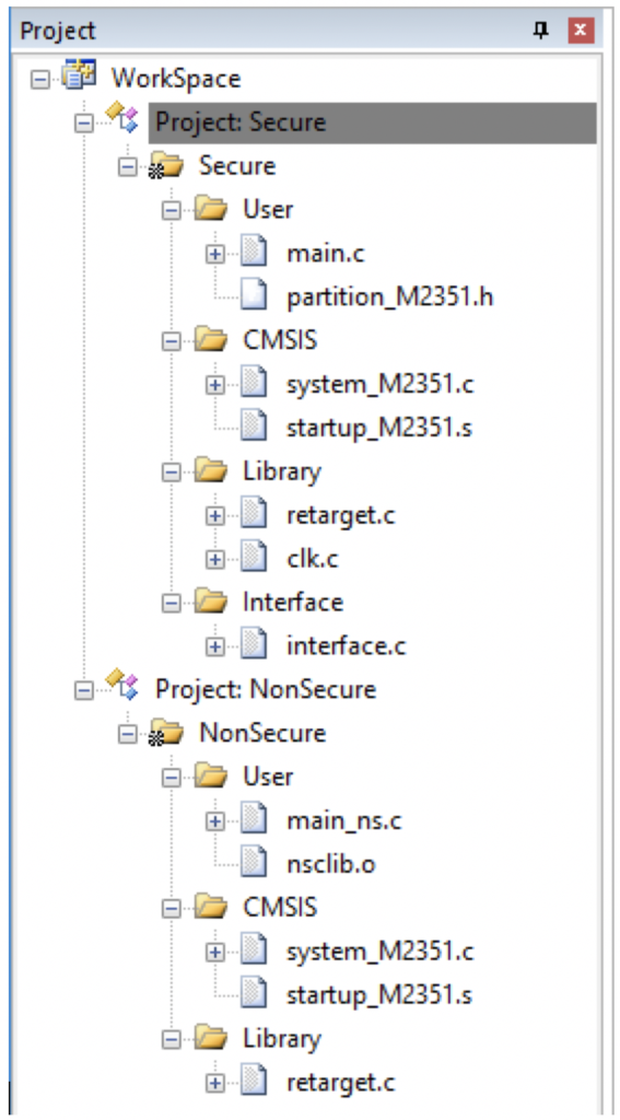 When a developer has successfully examined the examples, they can start to experiment by modifying the existing examples or trying to build a project from scratch. One of the first things a developer will notice is that TrustZone applications are broken up into two separate applications, the secure and non-secure application as shown in the image below: