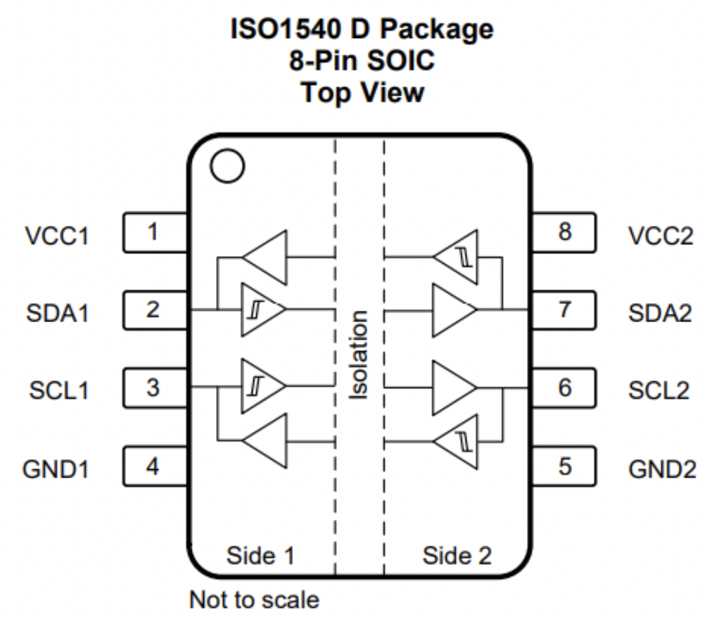 Figure 1 – The Texas Instruments ISO1540 provides 2500 Vrms isolation on the I2C bus and can be used with datarates up to 1 Mbps.