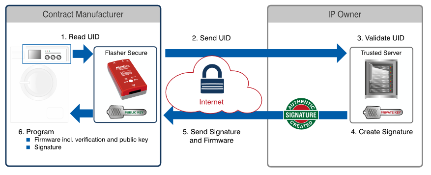 There are several ways this can be done, but one method is to use a secure flashing device like SEGGERS Flasher Secure. These devices can follow a multistep process that involves validating a user ID which allows the secure firmware to be installed on the device. The devices themselves limit how many and on what devices the firmware can be installed which helps to protect a team’s intellectual property and prevents unauthorized production of a product.